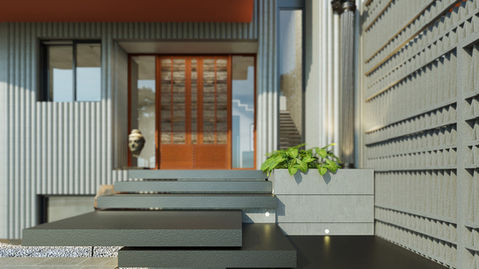 The ground floor is planned as the public area with sequential distribution of spaces from the front entry area to the lobby to the drawing/dining room while creating an open free-flowing space. The first floor is designed as a private area with bedrooms and a family lounge. The building façade has been designed to have an earthy modern Indian style so that it merges with the existing setting and the landscape.